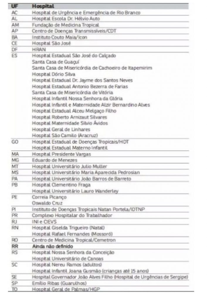 O Ministério da Saúde divulgou nesta quinta-feira (30) a lista de hospitais brasileiros que já montaram a estrutura necessária para receber pacientes que apresentem sintomas de infecção por coronavírus. Na lista divulgada, todos os estados brasileiros, com exceção de Roraima, informaram em quais unidades de saúde os pacientes que por ventura manifestem sintomas, busquem atendimento.