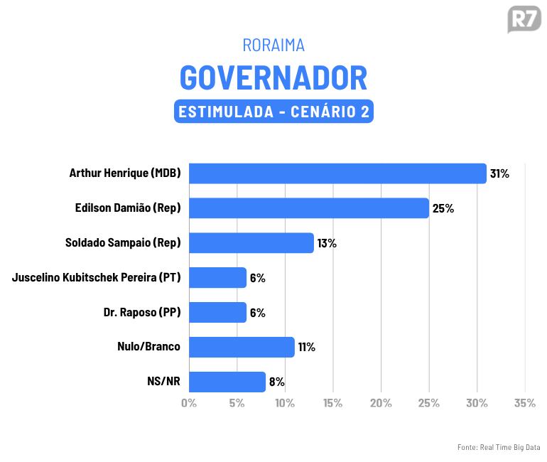 Em outro cenário pesquisado, o prefeito de Boa Vista, Arthur Henrique (MDB), tem 31% dos votos, contra 25% de Edilson Damião.