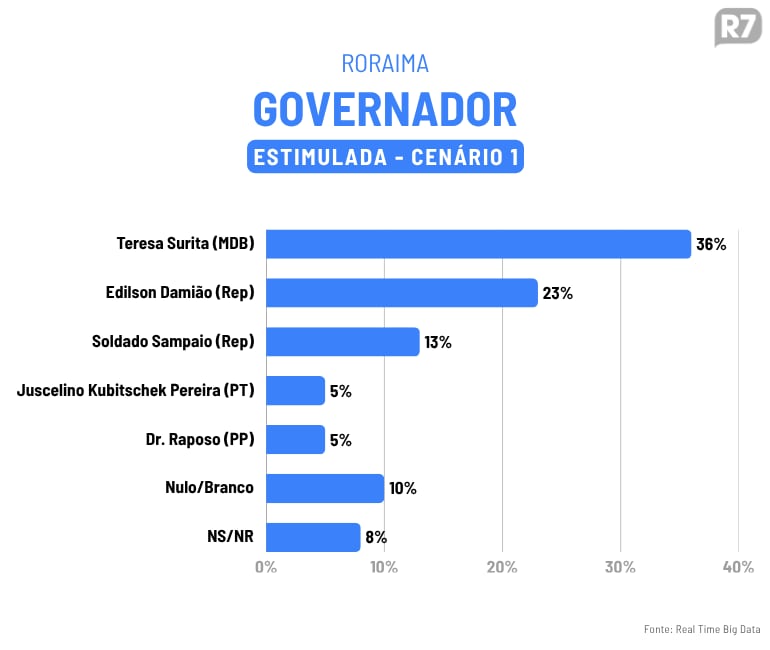 A ex-prefeita de Boa Vista Teresa Surita (MDB) lidera a disputa por intenções de votos para o governo de Roraima, com 36% dos votos, contra 23% do vice-governador do estado, Edilson Damião (Republicanos). O cenário foi testado pela pesquisa Real Time Big Data, divulgada nesta quarta-feira (15).