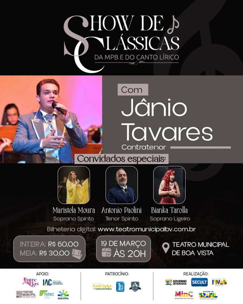 O contratenor roraimense Jânio Tavares apresenta, no próximo dia 19 de março, às 20h, no Teatro Municipal de Boa Vista, o espetáculo “Clássicos da MPB e do Canto Lírico”. A proposta é reunir elegância, grandes interpretações e uma causa social em uma única noite.