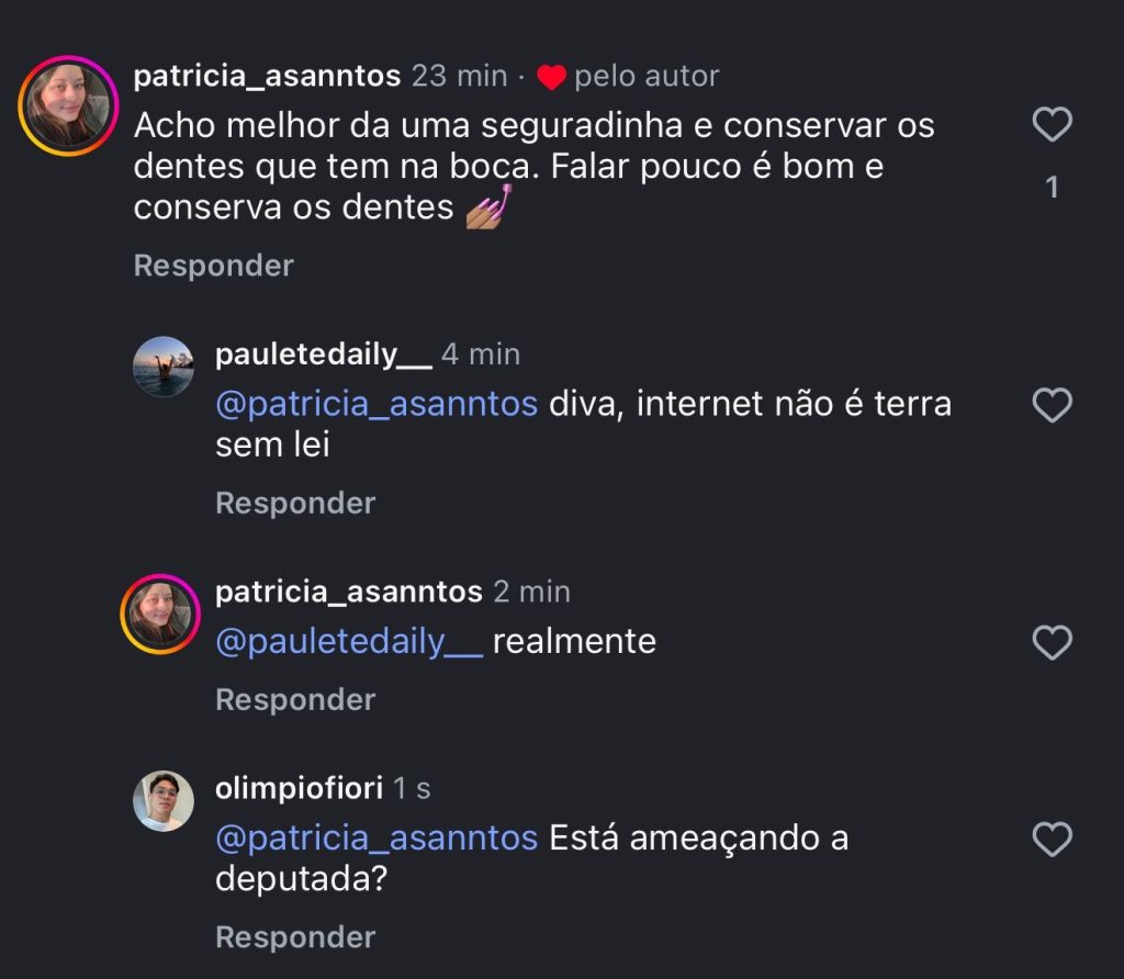 Menos de uma hora após a publicação, o perfil identificado como @patricia_asanntos comentou na postagem: