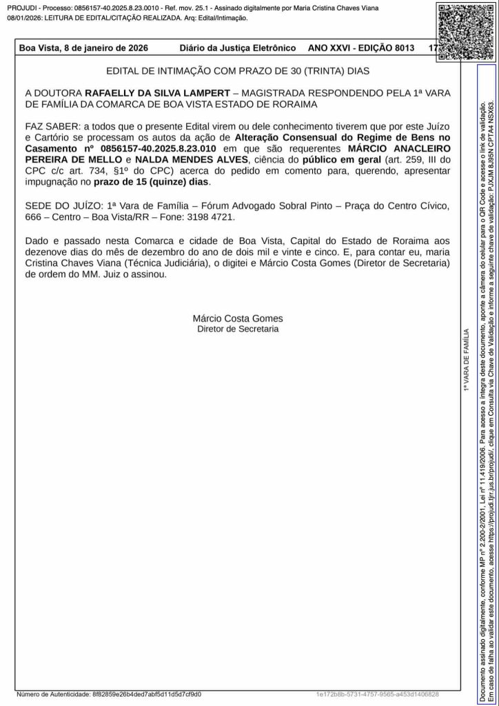 Início Edital Edital de Intimação 0856157-40.2025.8.23.0010 Edital de Intimação 0856157-40.2025.8.23.0010 Por Portal Roraima 1 - 06/02/2026 09:48 19 EDITALDEINTIMAO085615740 (1) Outras NotíciasOutras Notícias Lei de Roraima incentiva debate sobre uso seguro da internet nas escolas Mesmo após retirada do garimpo, malária segue como ameaça a indígenas em Roraima Após sete anos de atuação, cães da Guarda Civil de Boa Vista se aposentam Deixe seu comentário Cancelar comentário Please enter your comment! Please enter your name here You have entered an incorrect email address! Please enter your email address here Salvar meu nome e e-mail neste navegador para a próxima vez que eu comentar. Δ Mais lidas Ex-reitor da UERR alvo de investigações da PF assume cargo no... 02/02/2026 15:07 Projeto de IA liderado por mulheres indígenas chega a Roraima e... 01/02/2026 10:41 Prefeitura de Boa Vista divulga classificação das famílias inscritas no Minha... 23/01/2026 17:32 Ano letivo de 2026 da rede municipal de Boa Vista começa... 30/01/2026 16:26 Influenciador digital conhecido como ‘Pé de carrapicho’ é morto pela companheira... 14/12/2025 17:32