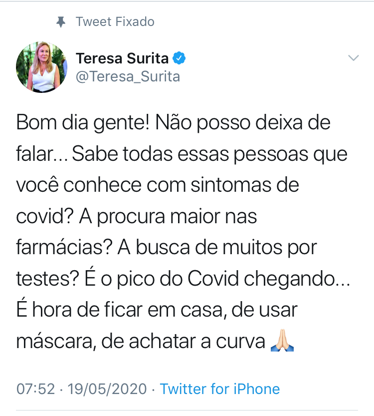 Pelo que a prefeita posta em seu Twitter, não será agora que ela irá visitar os postos de saúde ou cumprir agenda pública. Ela sempre quis administrar uma prefeitura virtual, onde a missão de encarar o povo ficasse somente na hora de pedir o voto. Teresa vai continuar mandando fechar tudo e pedindo para todos ficarem em casa, enquanto fica no Twitter se passando de a “rainha do coronavírus” e se colocando como vítima de uma grande trama.