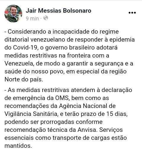 Na manhã desta quarta-feira (18), o presidente Jair Bolsonaro publicou em seu perfil no Twitter que, “considerando a incapacidade do regime ditatorial venezuelano de responder à epidemia de covid-19, o governo brasileiro adotará medidas restritivas na fronteira com a Venezuela, de modo a garantir a segurança e a saúde do nosso povo, em especial da Região Norte do país”.