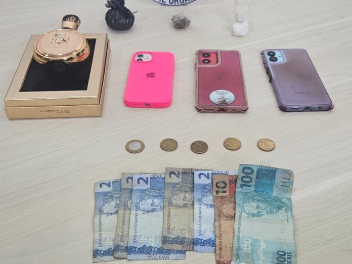 Dentro do carro estavam duas mulheres e o suspeito. Durante a vistoria, os agentes encontraram dois invólucros com substâncias análogas à maconha tipo skunk e à cocaína, além de três celulares e um bilhete com anotações que indicam possível atividade de tráfico.