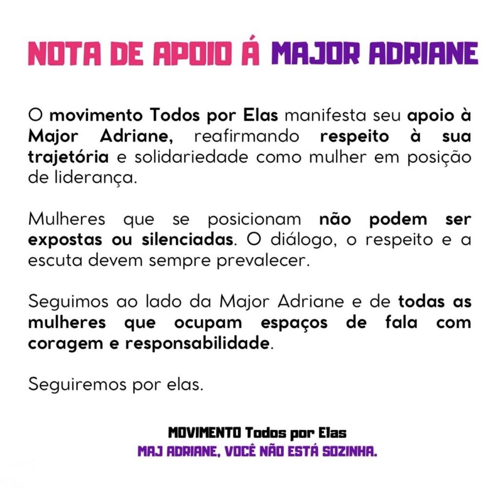 “Seguimos ao lado da major Adriane e de todas as mulheres que ocupam espaços de fala com coragem e responsabilidade.”