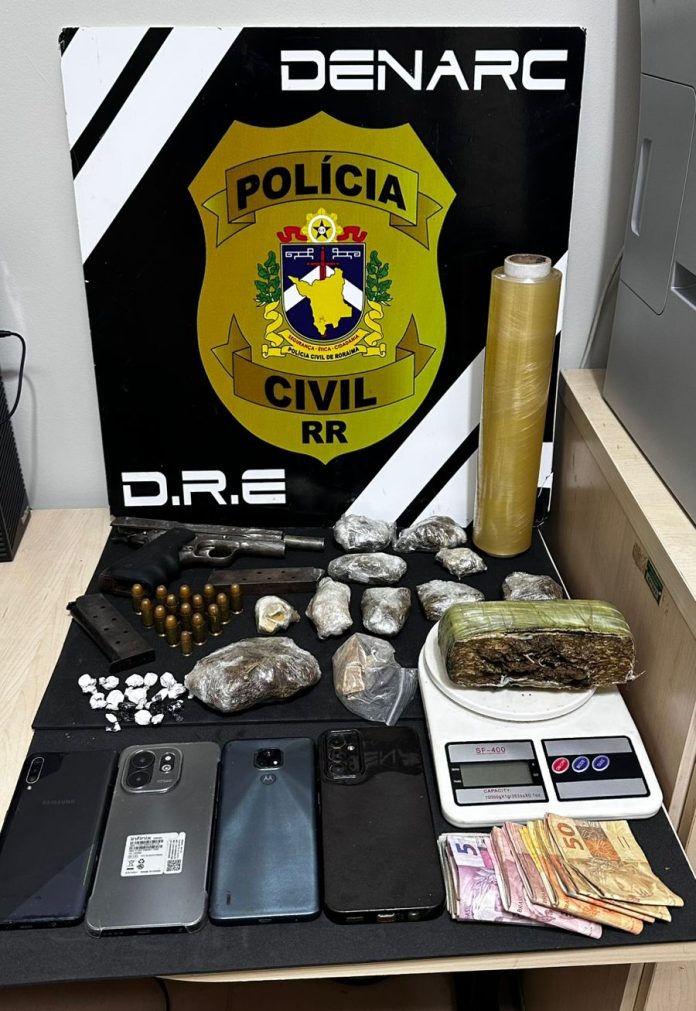 A Polícia Civil de Roraima (pcrr), por meio da Delegacia de Repressão a Entorpecentes (DRE) e do Departamento de Narcóticos (DENARC), em uma ação integrada com policiais militares do 2º Batalhão de Polícia Militar, desarticulou parte de uma rede de tráfico de drogas ao prender um casal de nacionalidade venezuelana com entorpecentes, arma de fogo de uso restrito e outros materiais ilícitos. A operação ocorreu ao longo desta terça-feira (6), nos bairros Silvio Leite e Alvorada, em Boa Vista.