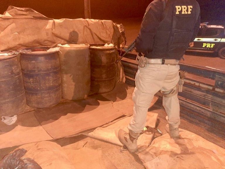 Durante patrulhamento, os agentes avistaram uma caminhonete com dois ocupantes, no km 515 da rodovia, próximo a um posto de gasolina. Ao realizarem a abordagem, os policias encontraram o combustível distribuído em tambores de gasolina e diesel.