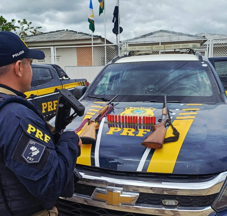 Durante patrulhamento na BR-174, em Mucajaí, policiais rodoviários federais abordaram uma caminhonete do tipo pick-up. Na fiscalização do veículo, foram encontradas duas espingardas calibre 28 e 17 munições.