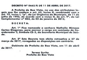 “Ao nomear Nathalia Mimosa Cortez Diogenes para exercer cargo em comissão na Secretaria Municipal de Saúde, os gestores públicos Teresa Surita e Arthur Henrique atentaram contra o princípio da moralidade administrativa”, cita trecho da ação popular.